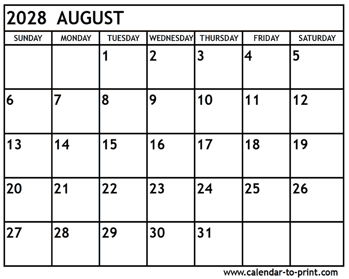 August 2028 calendar is a plain printable calendar. Our calendars are FREE to use and are available as PDF calendar and GIF image calendar. This August 2028 calendar can be printed on an A4 size paper. Print the calendar and mark the important dates, events, holidays, etc. for August on it. Good Luck !